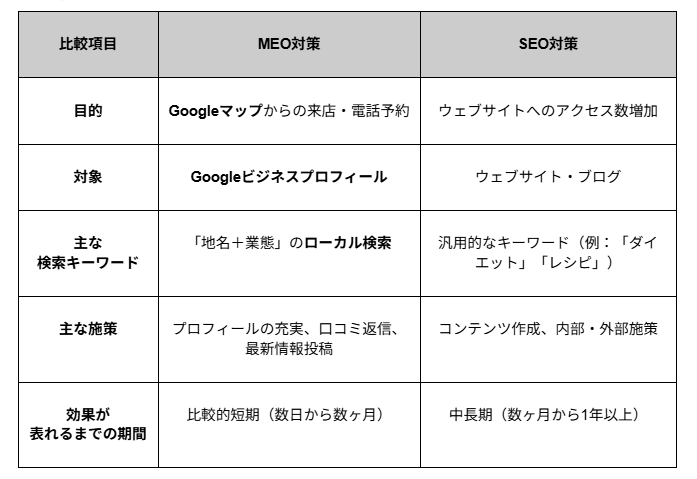 MEO対策(Map Engine Optimization)は、このGoogleビジネスプロフィールを最適化し、Googleマップ上での表示順位を上げるための施策です。SEO(検索エンジン最適化)がウェブサイト全体の順位を上げるのに対し、MEOは来店意欲の高いユーザーに直接アプローチすることを目的とします。