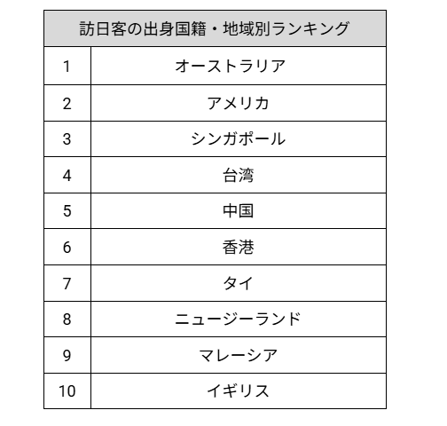 訪日客の出身国・地域別ランキングでは、以下の国々が上位を占めています。