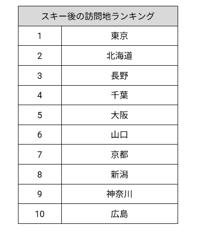 また、スキー後の訪問地ランキングでは、以下の都市や地域が人気を集めています。