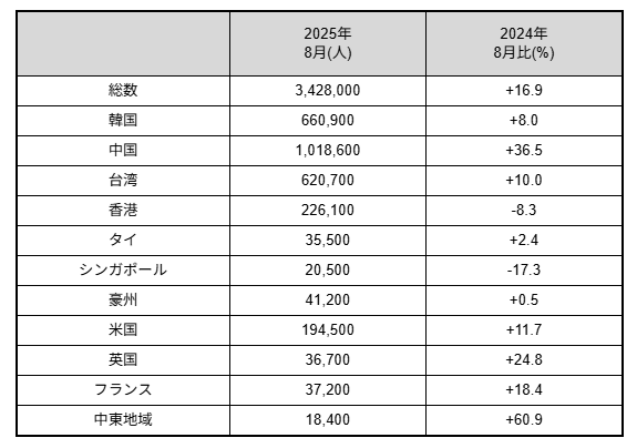 韓国からの訪日外客数は前年同月比8.0%増となりました。東南アジアや中国などへの旅行需要が高まる中でも、金浦~中部間の増便や清州~神戸間のチャーター便運航といった航空路線の強化が流入を後押ししました。特に、日本の地方都市へのアクセスが向上したことで、リピーター層や新たな層の需要を喚起し、8月として過去最高を記録する要因となりました。