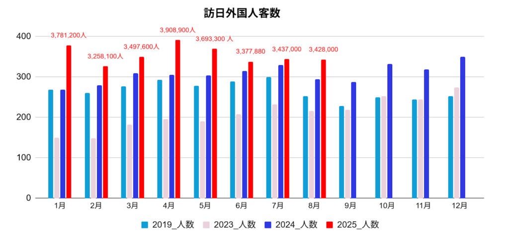 2025年8月の訪日外国人客数は推計342万人!過去最高を更新し同月ではじめて300万人を突破