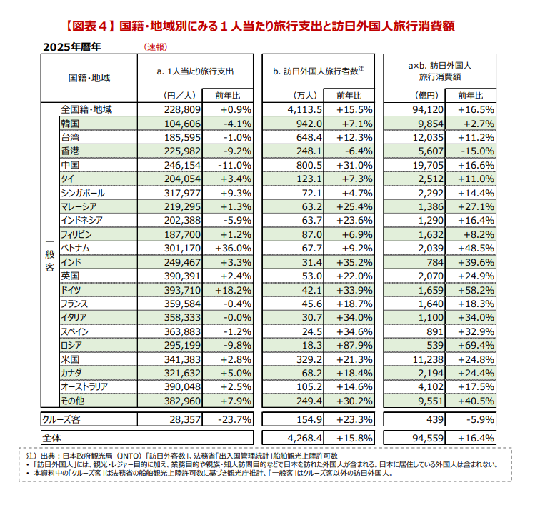 これは、滞在日数の長期化や、宿泊施設の単価上昇、さらには「せっかく日本に来たのだから良いものにお金を使いたい」という高付加価値消費へのシフトが鮮明に表れた結果と言えるでしょう。