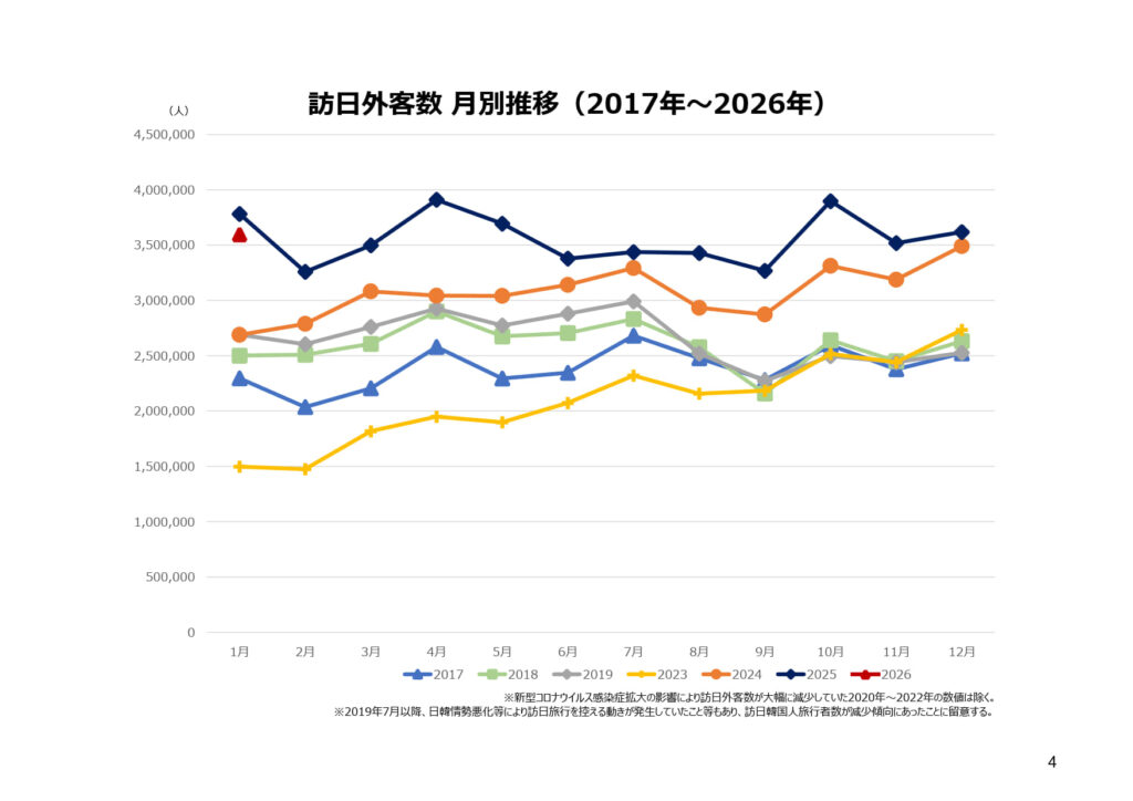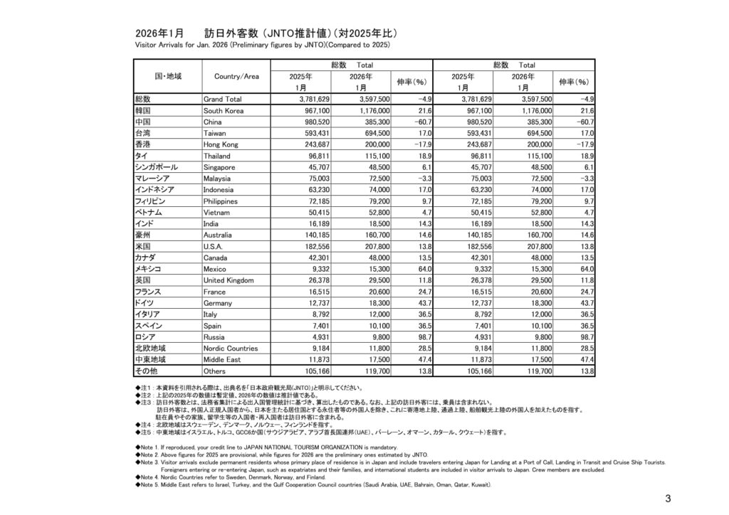 全体概況:2026年1月の訪日外客数は359万人、4年ぶりのマイナスへ